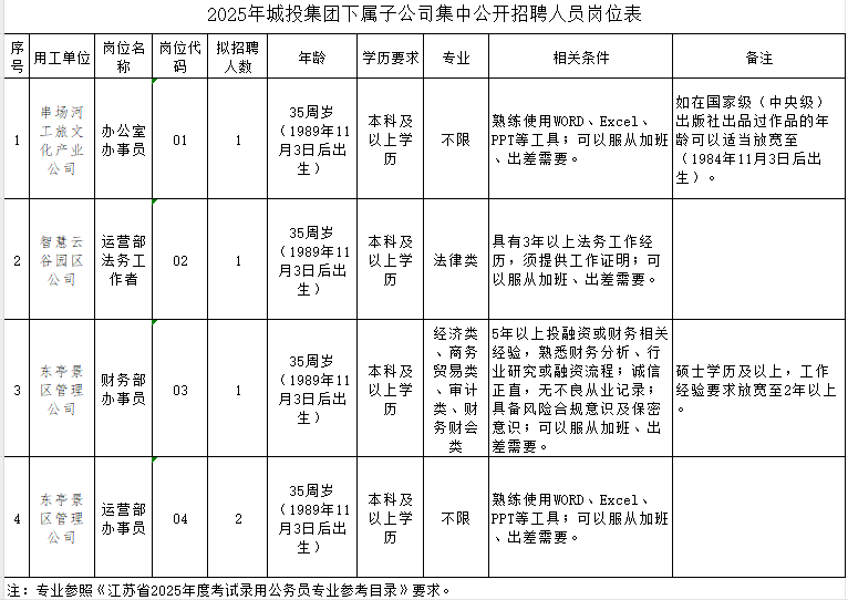具体详见附件《2025年城投集团下属子公司集中公开招聘人员岗位表》。