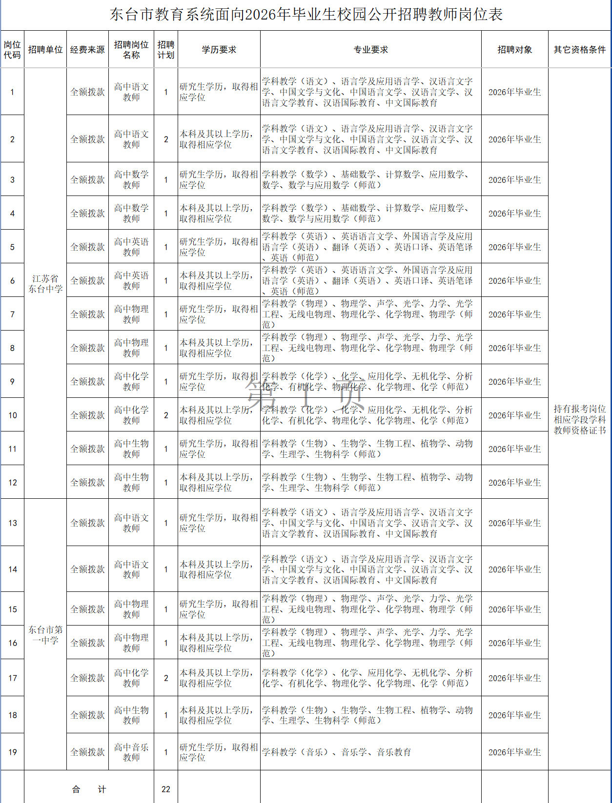 具体岗位及要求见附件1《东台市教育系统面向2026年毕业生校园公开招聘教师岗位表》,以下简称《岗位表》。